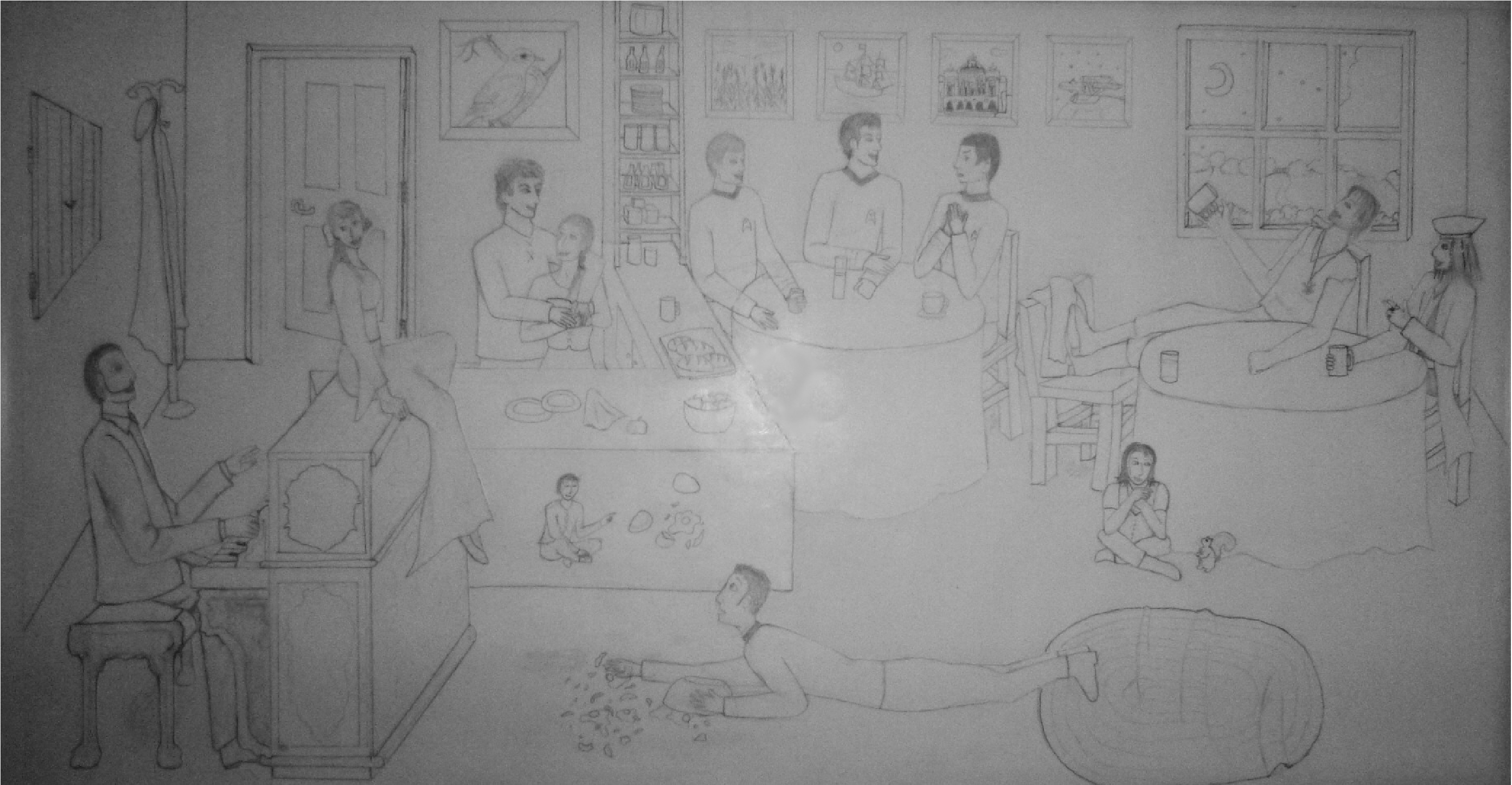One of my favorite and by far most complicated drawings is a scene I did of the main characters from each of my major stories hanging out together.  If you click, you can see it larger.