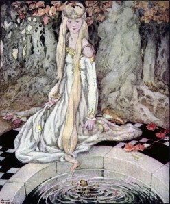 In the swamp, she meets a talking frog who claims to be a prince. After a lot of balking about kissing him (by the way–he’s a talking frog and all he wants is for you to kiss him so he can be human again–just do it, it’s not asking that much and what’s the worst that could happen?) she goes ahead and does. Only to turn into a frog herself (okay, I guess bad things could happen). Sound a lot like the Disney movie? I’m not sure the precise connection, but at least some editions of this have a label saying it’s the inspiration for the movie, so they must have bought rights or something.