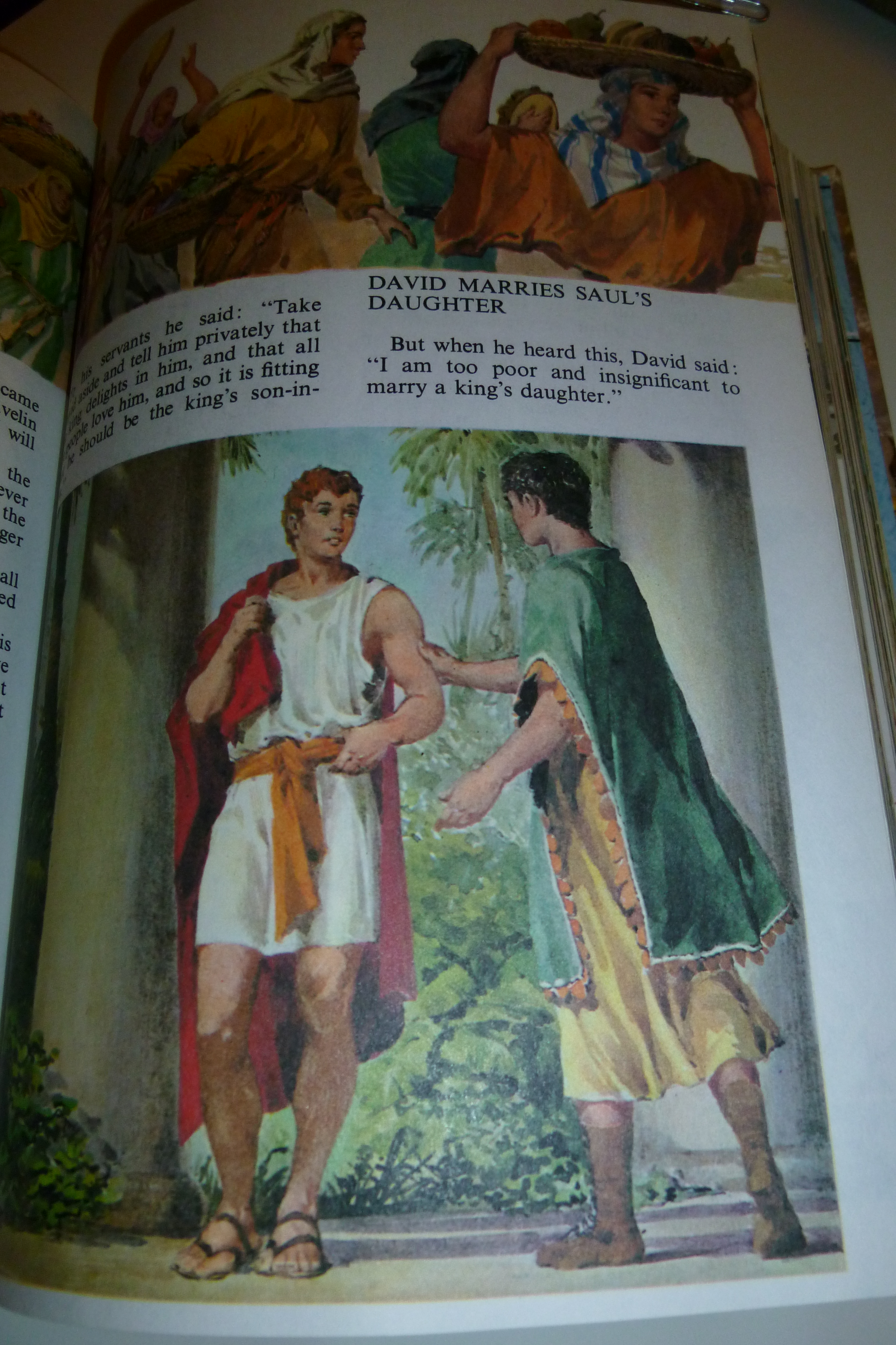 Later on David goes to the court of Saul, the current king, where he marries Saul’s daughter but also becomes so popular that Saul feels threatened and keeps flinging his spear at him, eventually driving him away from the court (I think that would make me leave court too!)
