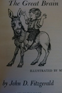 On the subject of funny kids books about boys, another favorite besides Gordon Korman is The Great Brain series by John D. Fitzgerald.  Based loosely on Fitzgerald’s childhood, the books are set in a small town in Utah in the 1890s.  The Great Brain of the title is John’s older brother Tom, who has a brilliant intellect and a “money-loving heart.”