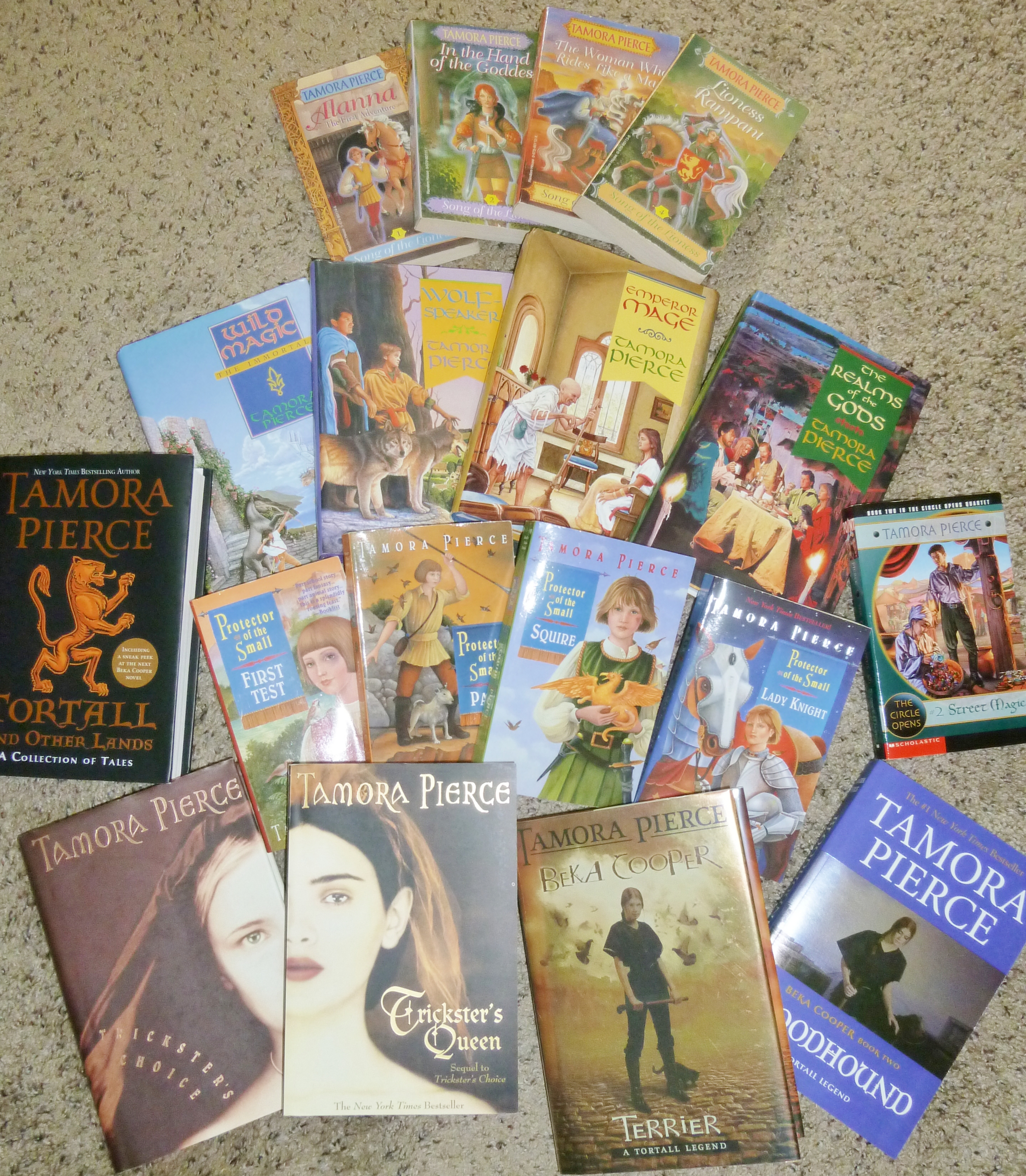 I have 18 Tamora Pierce books – basically her entire Tortall series (except Mastiff; I’m waiting on the paperback), plus my favorite Magic Circle book.
