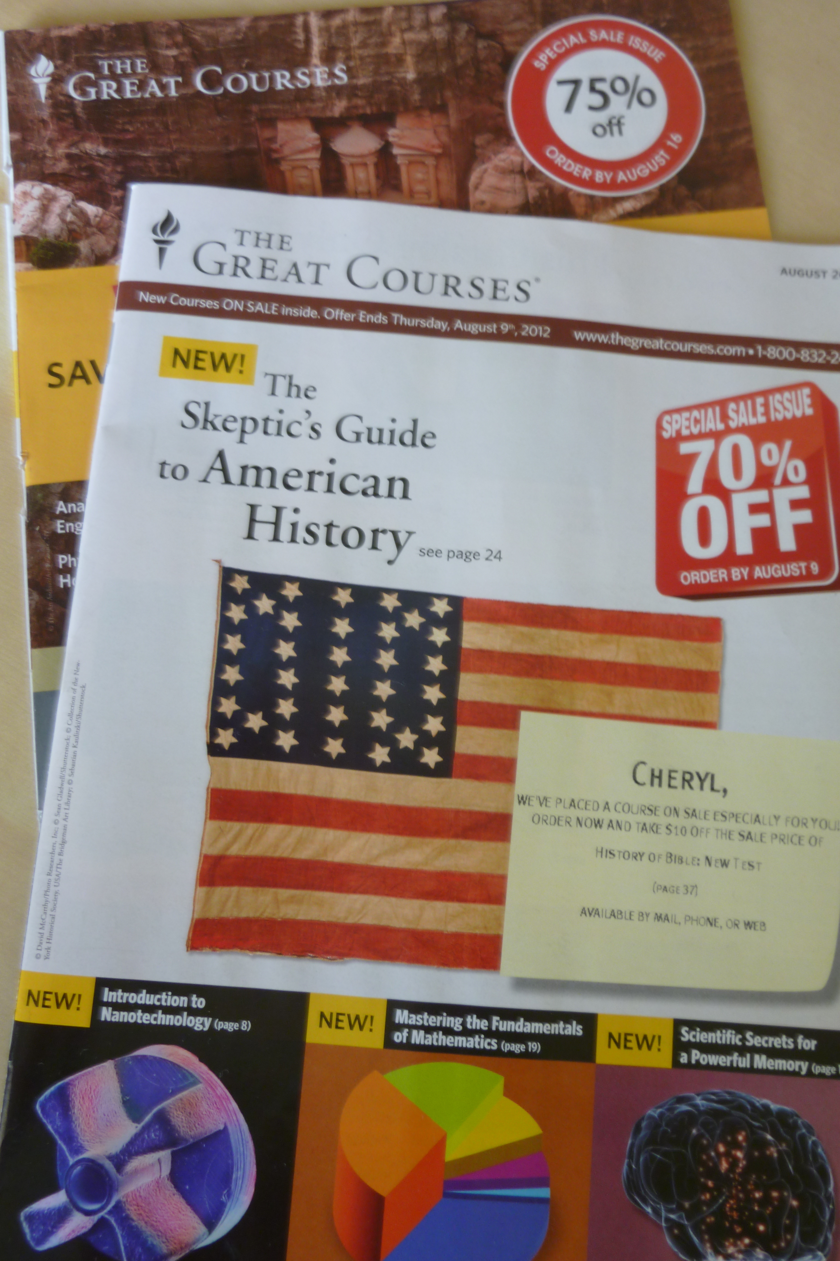 So if there’s something you’d like to learn more about (some history, maybe?), you can explore the Great Courses catalog online. Don’t be put off by the prices–they have near-constant 75% off sales, or even more. And anyway, it’s a lot less than most actual college classes–and no exam at the end!