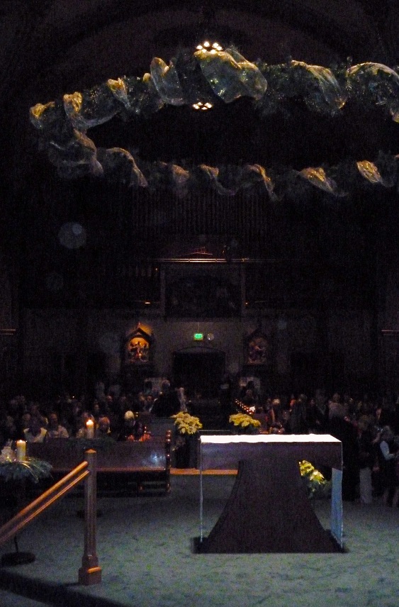 This shows the Advent wreath, newly decorated in gold for Christmas, above the new altar, with the pews beyond. It was much brighter in person… I volunteered to help decorate this year, and it’s fun getting that wreath up!