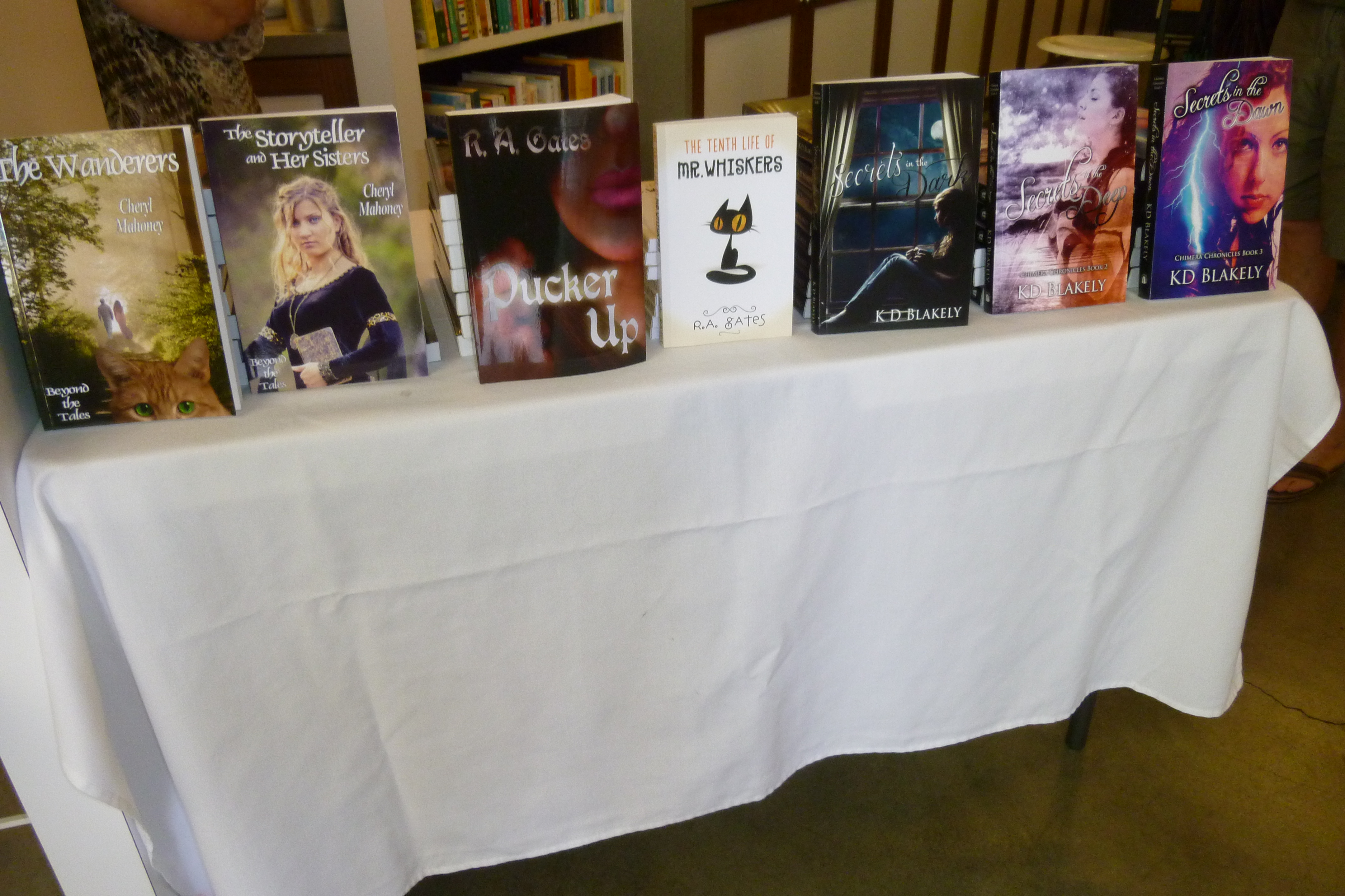 The lovely ladies with me are R. A. Gates, author of Pucker Up, with a heroine setting out to wake a sleeping prince, and The Tenth Life of Mr. Whiskers, a hilarious take on the zombie apocalypse (sort of); and K. D. Blakely, author of the Chimera Chronicles, about five friends exploring a magical land, with the first three books out (and two to come). I highly recommend their books to my fantasy-loving readers!