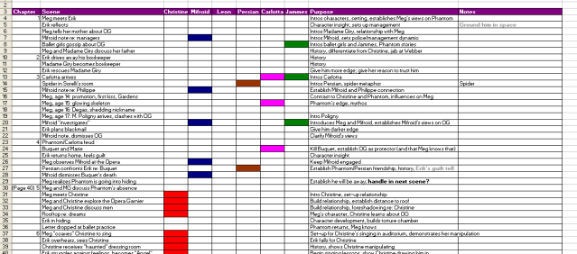 You can see from the red cells that Christine does not arrive on the scene immediately, which was as I planned. But I also swiftly realized that there were long gaps where characters like the Persian (brown) and Jammes (green) went missing, something I worked on correcting in revisions. I also realized that some scenes repeated the same theme or emotional arc too closely, or that others were unnecessary in the plot, their minor purpose easily folded into another scene.